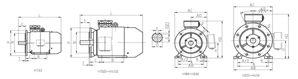 | Frame | Flange | poles | D | E | F | Ga | M | N | Pc | Rd | Sb | T | holes | AC | AD | HF | L | |||||||||